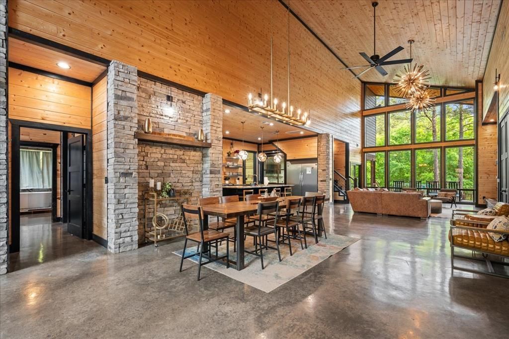 Off the Hook is a striking 5-bedroom, 5.5-bath luxury cabin set on a scenic pond in the heart of Hochatown. Designed for both relaxation and entertainment, the chef's kitchen features sleek black cabinetry, granite countertops, and stainless-steel appliances, flowing seamlessly into an open-concept living and dining area with expansive windows and upscale lighting that highlight the surrounding natural beauty. Guests will enjoy kicking back in front of the stacked stone gas fireplace while watching TV.Four spacious primary suites each offer private patios with access leading to the hot tub, along with spa-inspired bathrooms featuring beautifully tiled walk-in showers. A standout bunk room includes 13 twin beds, a private ensuite bath, and a dedicated play area with lounge seating and a retro arcade, perfect for hosting larger groups.The lower-level game room is fully equipped with a full-size pool table, shuffleboard, Golden Tee arcade, and a TV. Outdoor amenities abound with a rock fireplace, ping pong, horseshoes, a playset, and opportunities to kayak and enjoy the pond. The evening wraps up around the firepit, perfect for a warm glow and s'mores. This property offers the ideal blend of luxury, comfort, and short-term rental potential in a great location.